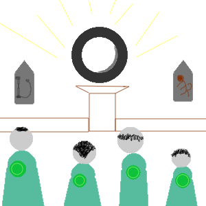 À direita e à esquerda, estão representados, sob a forma de iconografia, alguns dos símbolos e objectos sagrados deste culto, nomeadamente o Macaco (ferramenta e também criatura mitológica que eleva os justos) e a Bomba de Ar (que representa o sopro vital).