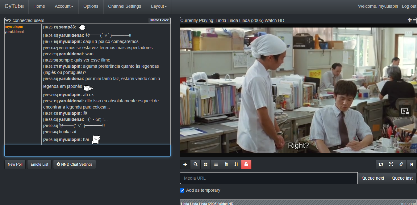Assistiremos a Linda Linda Linda (2005) dia 11/10 às 20h BRT/00h WEST no https://cytu.be/r/mokoich . Legendas em inglês, por ora. Se a demanda for grande, haverá reprise com legendas em português.